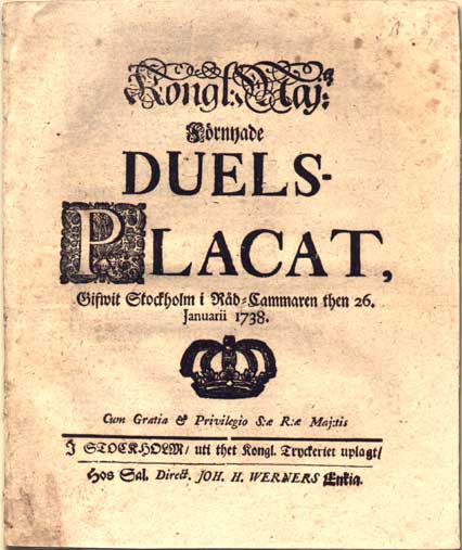 I Sverige, liksom i övriga Europa, försökte de styrande stävja det misshagliga duellerandet. Varje år dödades hundratals män i dueller runtom i Europa. 1662 utfärdades i Sverige ett förbud, ett så kallat duellplakat: Kongl. Maj:s Placat och förbudh angående allehanda Dueller och otwungne Slagsmål. En ytterligare skärpning med stränga straff för såväl duellanter som sekundanter kom 1682: Kongl. Maj:s Stränge och Alfwarlige påbudh angående Dueller och Slagzmål samt förordning öfwer den reparation som den Beskymfade hafwer at undfå. Effekten av förbuden var troligen begränsad, och 1738 kom ännu ett duellplakat, vilket jag inköpte hos ett antikvariat på antikmässan i Skara 6/4 2002. Utfärdare var kung Fredrik I (regerade 1720-51; gift med Karl XII:s syster Ulrika Eleonora, drottning 1719-41). Texten återges nedan; jag har behållit den gamla svenskan dels för känslans skull, dels för att jag vill undvika förvanskning. Kungen refererar till sig själv i ”majestatis pluralis”, d.v.s. ”Vi”, ”Oss”, ”Vår”. Ordföljden är närmast tysk, och för att göra texten något enklare att läsa har jag sammanställt en liten guide till texten: