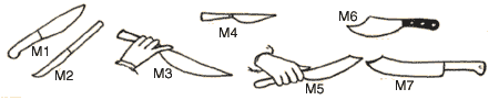 Låt oss först titta närmare på terminologin för att reda ut grundbegreppen. Det råder viss förvirring om vad som skiljer knivar och dolkar åt. Många tror att kniven är eneggad, medan dolken är tveeggad. Det är bara det att många dolkar är eneggade, så där faller den förklaringen. I själva verket är det enkelt. En kniv har sin tånge och grepp vid sidan om bladets centrumlinje (jämför med en kökskniv), vilket gör den särskilt lämpad för skärande. Dolken har däremot sin tånge och grepp på bladets centrumlinje (likt greppet på en fil), varvid stötar och stick blir mer kraftfulla. Svårare än så är det inte. Under svensk medeltid fanns det bl a följande namn på knivar och dolkar: rytinger, daggert, stekamaez samt kniver. En rytinger var troligen en kraftig kniv i stil med fig. J3. Daggert var en vanlig dolk, medan det med stekamaez troligen avsågs "stick-kniv" (jfr tyskans "messer"), det vill säga en (längre) dolk. "Kniver" torde vara självförklarande.