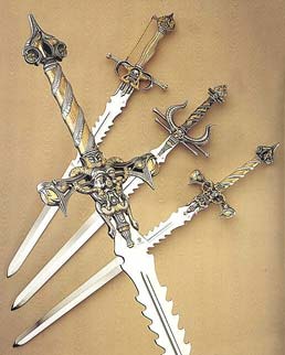 I samma anda har vi ett gäng rostfria köksknivar från spanska Marto, lämpade för barbar-wannabes. Det är svårt att avgöra vilket som är fulast, så hela bunten får vara med. Jag misstänker att designern överdoserade på taskig heavy metal och sämre barbarfilmer på 80-talet Återigen dessa sågtandade klingor, men nu där det inte gör någon nytta alls. Hjalten är överarbetade till det absurdas gräns; en favorit är svärdet i mitten - de där "hornen" som går ner mot greppet borde göra svärdet närmast omöjligt att använda. Av någon outgrundlig anledning så verkar en del tillverkare tro att fantasyvapen ska se ut som om de inspirerats av lika delar LSD och Boris Vallejo-målningar. Det är ytterst sällan man ser praktiska fantasyvapen - svärd som inte liknar medeltida svärd, men som ändå har ett funktionellt utseende. Huromhelst kan den hugade spekulanten inhandla de här glitterpinnarna för 2950:- styck.